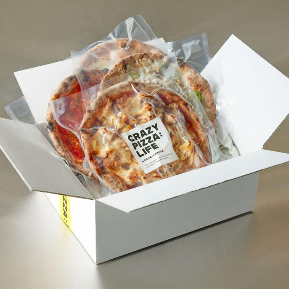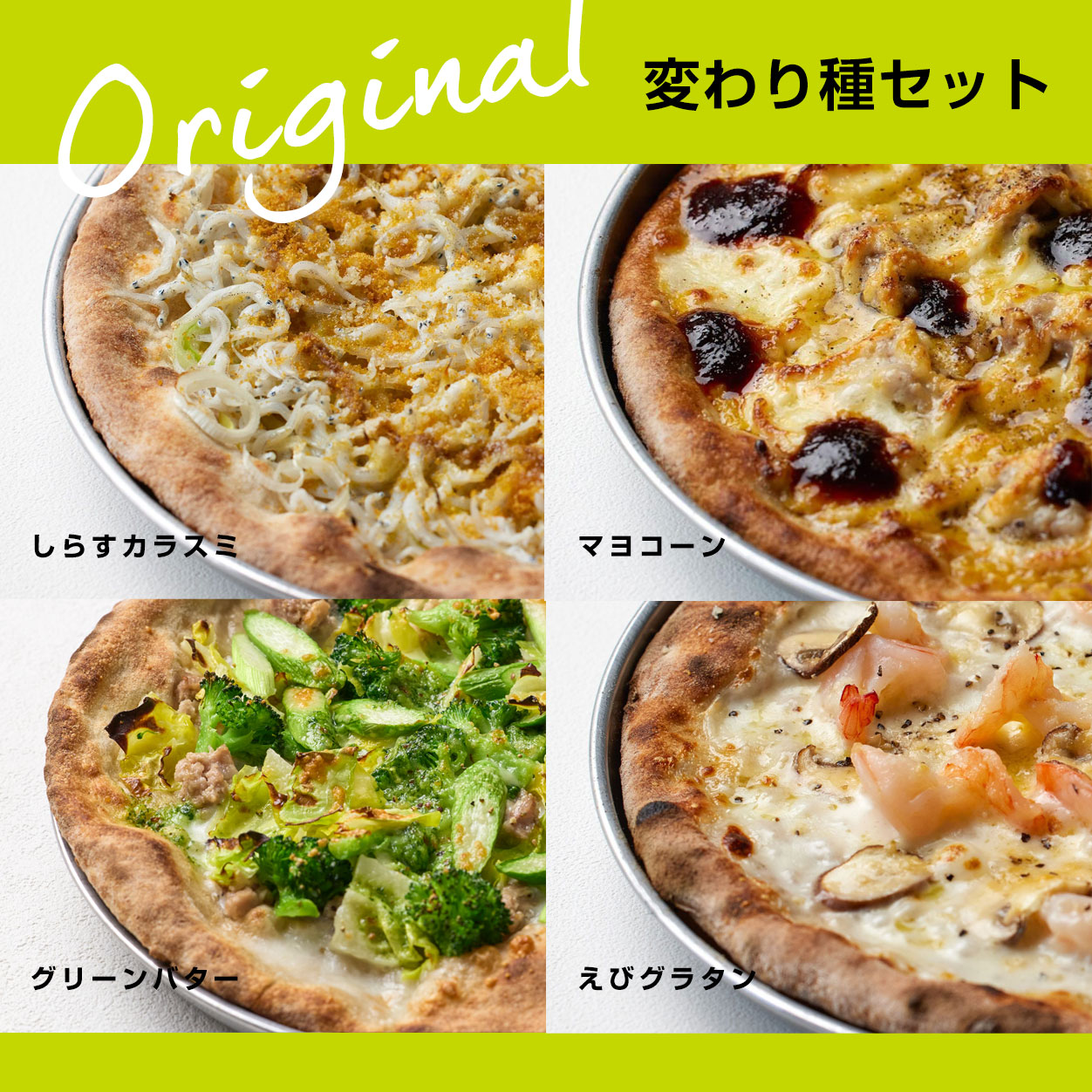 | 変わり種4枚セット | しらすカラスミピザ x 1枚 マヨコーンピザ x 1枚 グリーンバターピザ x 1枚 えびグラタンピザ x 1枚 合計4枚(各直径約20cm) |