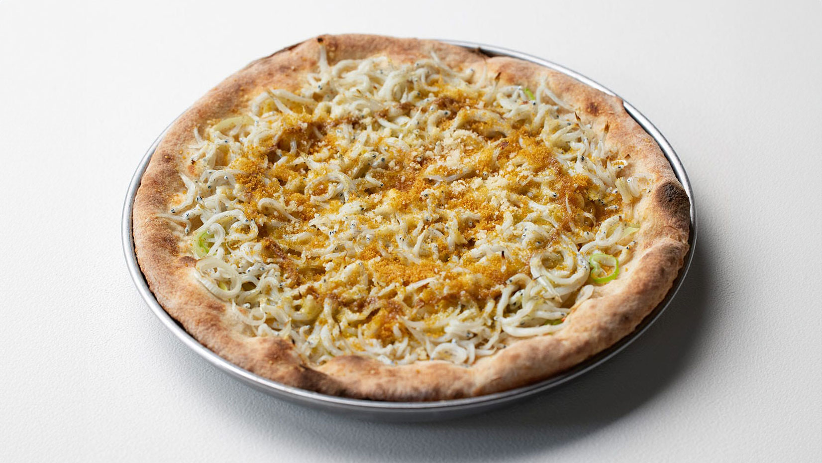 和歌山県からのお取り寄せ「山利のしらす」のピザ。ふわっふわのしらすを生地が見えないほどたっぷりのせれば、塩味抑えめのピザ生地との相性もよく、素材本来の味を楽しめる贅沢な一枚。別添えのカラスミをかけてめしあがれ。ちょっといいお酒と一緒に食べたい気分。